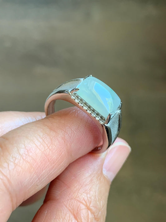 Natural Grade A Icy Translucent Gelatinous Pastel Green Jadeite Saddle Cabochon Ring Sterling Silver Size 8 Adjustable 天然冰胶晴底翡翠马鞍银镶戒指 TMQ107