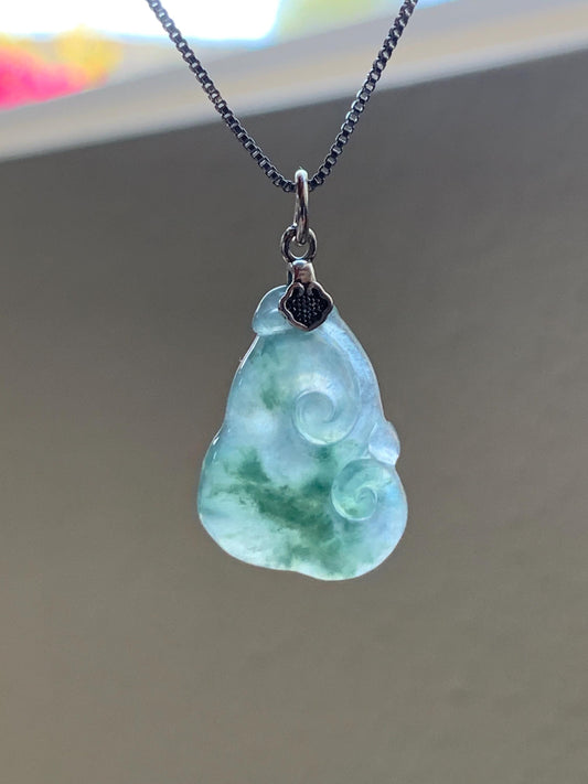 Natural Grade A Icy Highly Translucent Gelatinous Green Marbled Jadeite Pudgy Ruyi Petite Pendant Sterling Silver 3g 天然冰胶老种飘绿花翡翠如意吊坠 MPR190