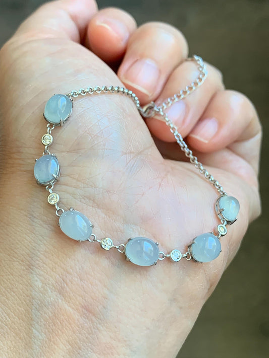 Natural Grade A Icy Translucent Gelatinous Pastel Purple Jadeite Link Chain Bracelet Sterling Silver 6.5”-7.75” 4g 天然冰浅紫底翡翠蛋面银镶手链 MDZL120