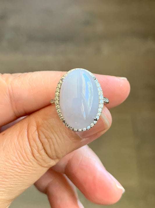 Natural Grade A Icy Translucent Pastel Purple Undertone Jadeite Oval Cabochon Ring Sterling Silver Size Adjustable 天然冰淡紫底翡翠大蛋面银镶戒指 DDZ-E