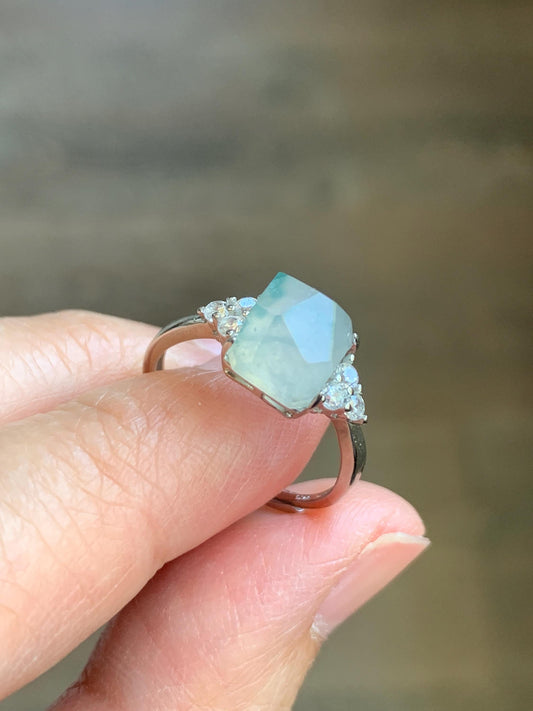 Natural Grade A Icy Translucent Gelatinous Light Green Marbled Faceted Jadeite Ring Sterling Silver Size 7 Adjustable 天然冰胶飘花翡翠切割面银镶戒指 MQG80A