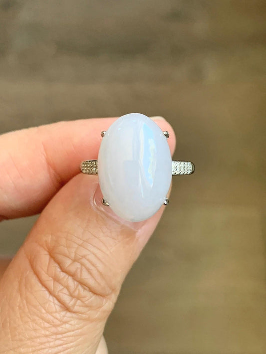 Natural Grade A Icy Translucent Pastel Purple Undertone Jadeite Oval Cabochon Ring Sterling Silver Size Adjustable 天然冰淡紫底翡翠大蛋面银镶戒指 DDZ-C