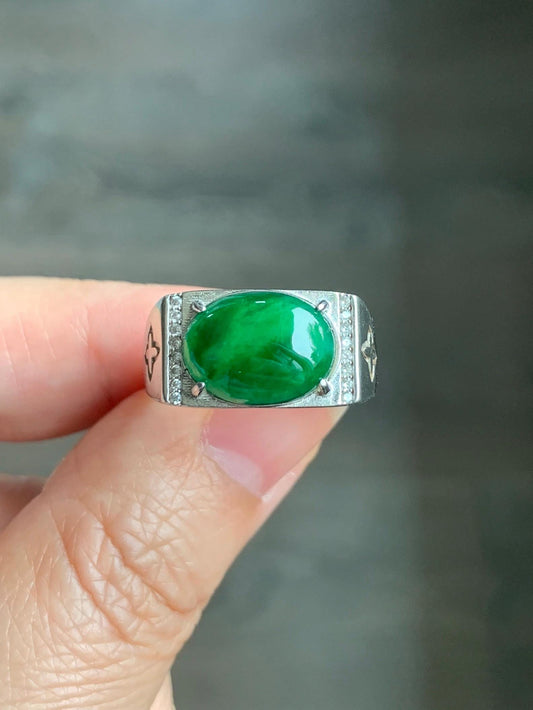 Natural Grade A Icy Translucent Vibrant Green Jadeite Oval Cabochon Solitaire Ring Sterling Silver Size 8.5 Adjustable 天然冰危绿翡翠蛋面银镶戒指 WLT150