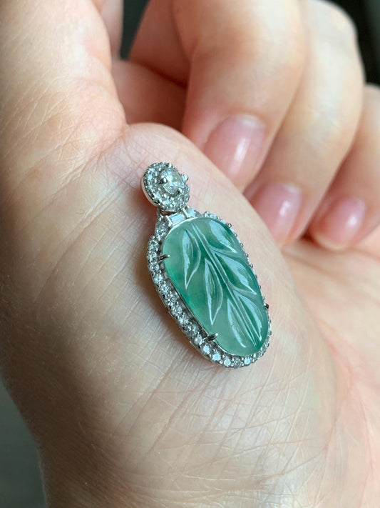 Small Natural Grade A Icy Highly Translucent Gelatinous Green Marbled Jadeite Leaf Pendant S925 Sterling Silver 天然冰胶飘绿花翡翠叶子银镶吊坠 YXR88-D