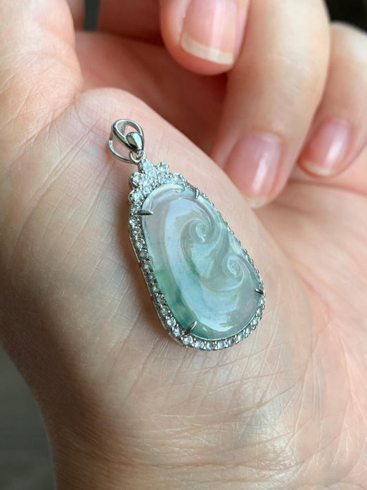 Small Natural Grade A Icy Highly Translucent Gelatinous Green Marbled Jadeite Ruyi Pendant S925 Sterling Silver 天然冰胶飘绿花翡翠如意银镶吊坠 YXR88-B