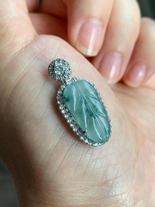 Small Natural Grade A Icy Highly Translucent Gelatinous Green Marbled Jadeite Leaf Pendant S925 Sterling Silver 天然冰胶飘绿花翡翠叶子银镶吊坠 YXR88-C