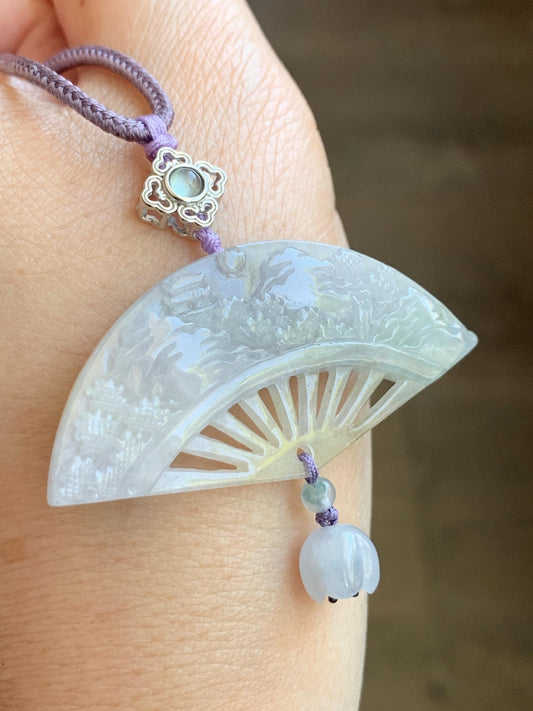 Natural Grade A Icy Translucent Tricolored Jadeite Shan Shui Landscape Fan Pendant Rope Necklace 25” Sterling Silver 天然冰胶紫三彩翡翠山水扇子吊坠 SCSS-A