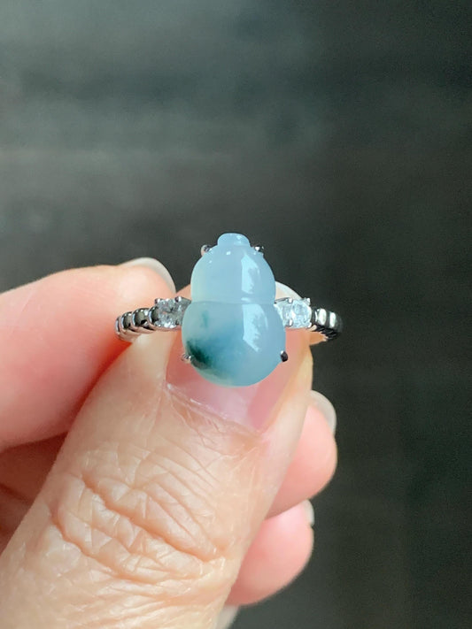 Certified Natural Grade A Icy Translucent Gelatinous Teal Green Marbled Jadeite Gourd Hulu Ring Sterling Silver sz 7.25 天然冰胶蓝花翡翠葫芦镶嵌戒指 1503