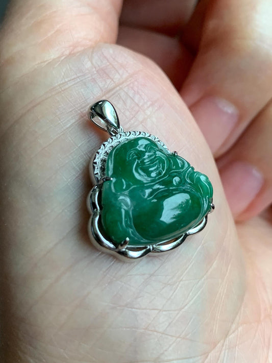 Certified Natural Grade A Icy Translucent Deep Green Jadeite Buddha Pendant Sterling Silver 3.35g 天然糯冰满绿翡翠小佛公镶嵌吊坠 8771