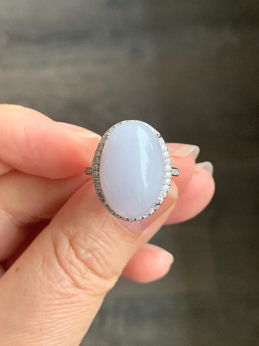 Natural Grade A Icy Translucent Pastel Purple Undertone Jadeite Oval Cabochon Ring Sterling Silver Size Adjustable 天然冰淡紫底翡翠大蛋面银镶戒指 DDZ-A