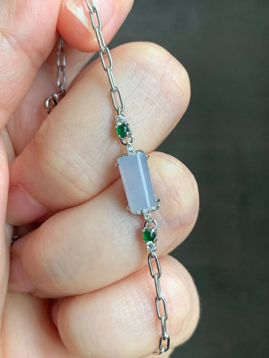 Natural Grade A Icy Translucent Pastel Purple & Vibrant Green Jadeite Chain Bracelet Sterling Silver 6.25”-7.5” 3g 天然冰淡紫翡翠马鞍银手链 DZA98