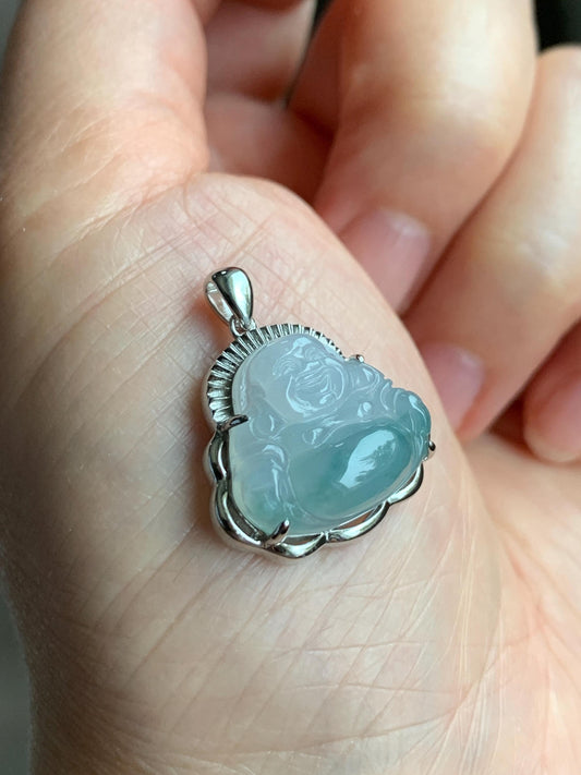 Certified Natural Grade A Icy Translucent Gelatinous Pastel Blue Marbled Jadeite Buddha Pendant Sterling Silver 3.83g 天然冰胶淡蓝飘花翡翠佛公镶嵌吊坠 8773