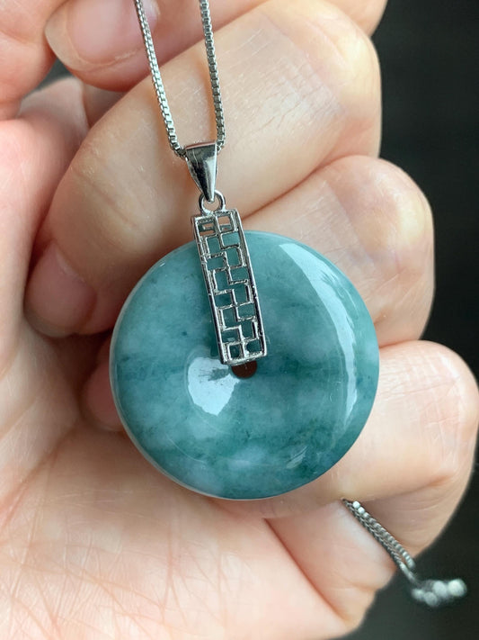 Natural Grade A Icy Translucent Teal Blue Marbled Jadeite Ping An Kou Donut Pendant Sterling Silver Bail 9g 天然糯冰飘花翡翠平安扣吊坠 MPK-3