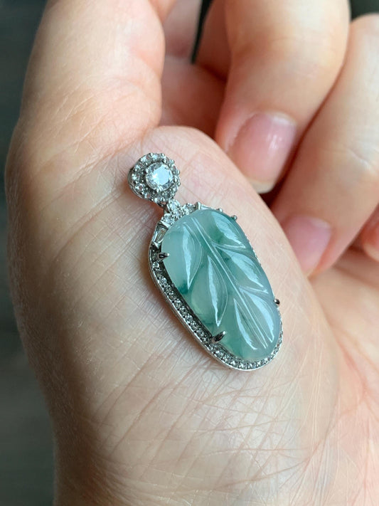 Small Natural Grade A Icy Highly Translucent Gelatinous Green Marbled Jadeite Leaf Pendant S925 Sterling Silver 天然冰胶飘绿花翡翠叶子银镶吊坠 YXR88-E