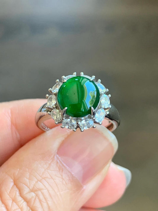 Natural Grade A Guatemalan Icy Translucent Vibrant Green Round Cabochon Jadeite Halo Ring Sterling Silver Size Adjustable 天然冰危绿翡翠银镶戒指 WLH150