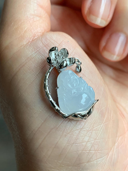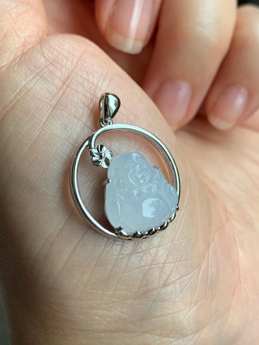 Certified Natural Grade A Icy Translucent Gelatinous White Jadeite Buddha Pendant Sterling Silver 3.63g 天然老种冰胶淡紫底翡翠佛公镶嵌吊坠 8772
