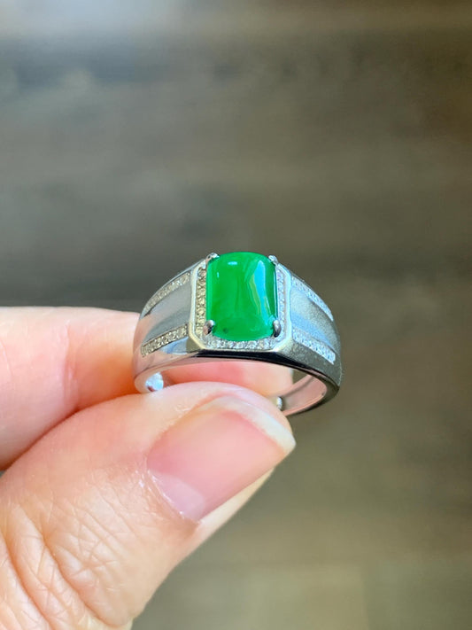 Natural Grade A Guatemalan Icy Translucent Vibrant Green Jadeite Saddle Ring Sterling Silver Size Adjustable 天然冰危绿翡翠马鞍银镶戒指 WLD150B