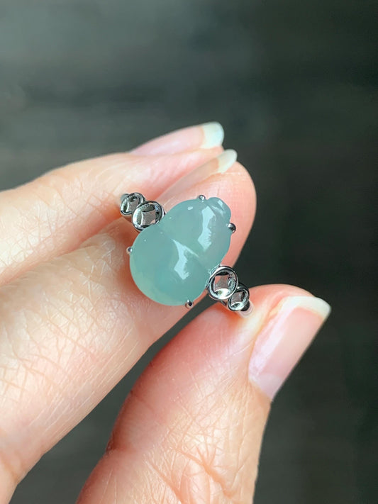Certified Natural Grade A Icy Translucent Gelatinous Light Green Jadeite Gourd Hulu Ring Sterling Silver size 7 US 2.7g 天然冰胶晴蓝底翡翠葫芦镶嵌戒指 1504