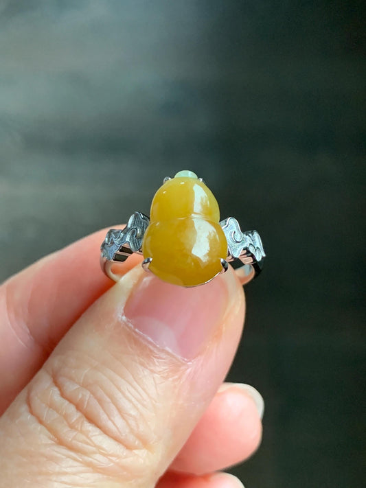 Certified Natural Grade A Icy Translucent Gelatinous Deep Yellow Jadeite Gourd Hulu Ring Sterling Silver size 7.25 US 天然糯冰油黄翡翠葫芦镶嵌戒指 1501