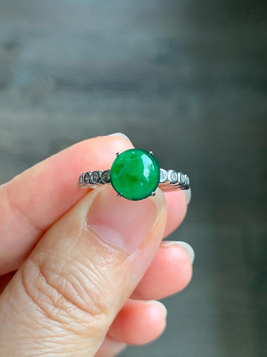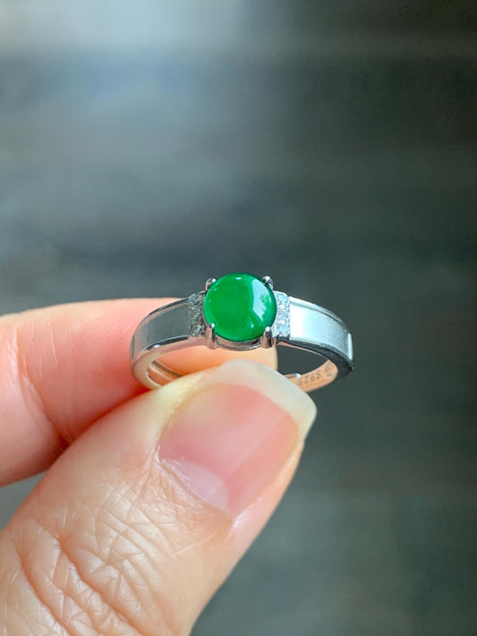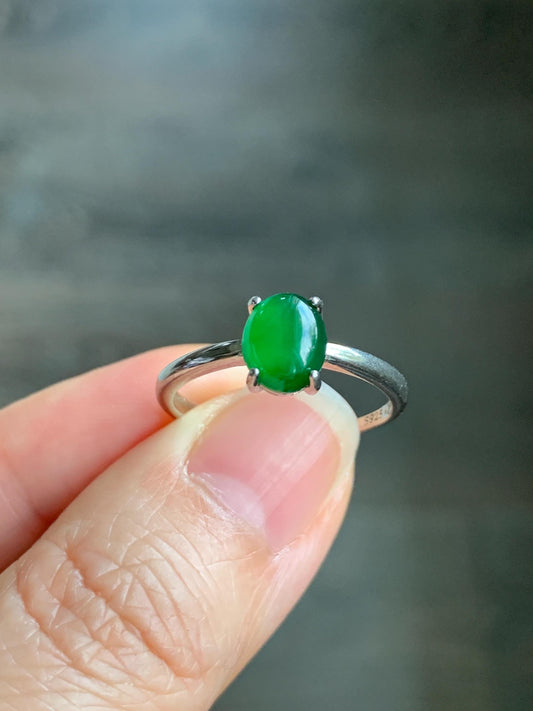 Natural Grade A Guatemalan Icy Translucent Vibrant Green Jadeite Solitaire Style Ring Sterling Silver Size Adjustable 天然冰危绿翡翠银镶戒指 WLY77