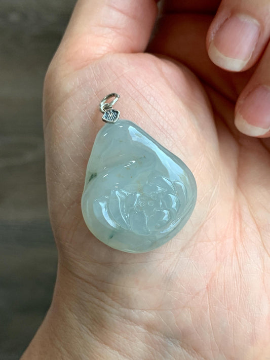Natural Grade A Icy Translucent Gelatinous Beige Pastel Green Jadeite Lotus Flower Teardrop Pendant Sterling Silver 12g 天然冰胶晴底撒金翡翠莲花水滴吊坠