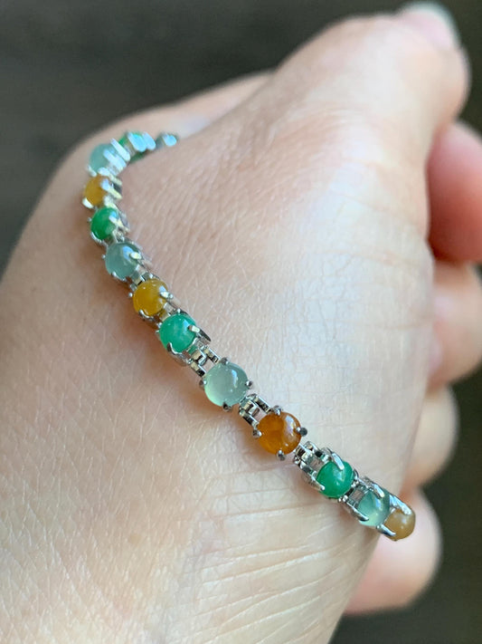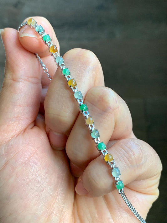 Certified Natural Grade A Icy Translucent Multicolored Jadeite Link Chain Style Bracelet Sterling Silver 6.25”-7.5” 4.3g 天然冰多宝翡翠银镶手链 1150
