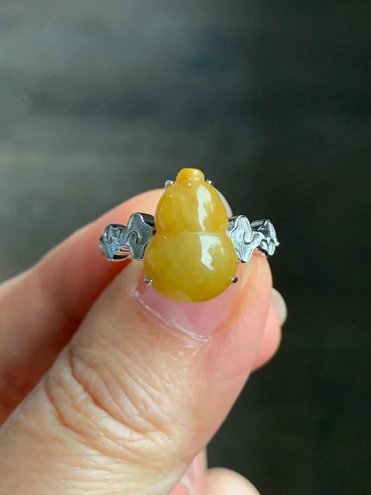 Certified Natural Grade A Icy Translucent Gelatinous Deep Yellow Jadeite Gourd Hulu Ring Sterling Silver size 7.25 US 天然糯冰油黄翡翠葫芦镶嵌戒指 1500