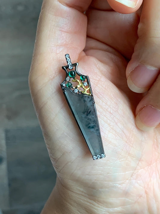 Certified Natural Grade A Guatemalan Icy Highly Translucent Wuji Jade Jadeite Wu Shi Pai Vase Pendant Sterling Silver 天然冰胶危乌鸡翡翠无事牌镶嵌花瓶吊坠 272