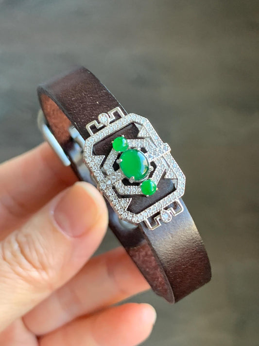 Natural Guatemalan Icy Translucent Vibrant Green Jadeite Buckle Bracelet Sterling Silver Adjustable 6”-8” 天然冰危绿翡翠银镶手牌手表镯
