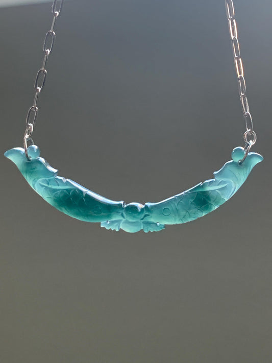 Natural Guatemalan Icy Translucent Deep Teal Blue Jadeite Double Fish Crescent Pendant 999 Sterling Silver Necklace 20” 天然冰胶危料湖水蓝翡翠双鱼玉横足银项链