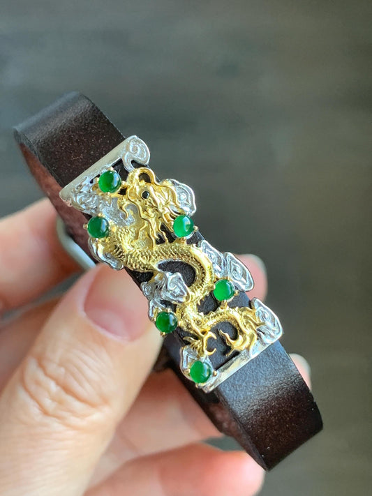 Natural Guatemalan Icy Translucent Vibrant Green Jadeite Dragon Buckle Bracelet Sterling Silver Adjustable 6”-8” 天然冰危绿翡翠银镶手牌手表镯