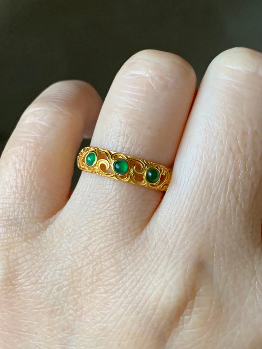 Natural Guatemalan Premium Vibrant Green Jadeite 3-Stone Band Ring S925 Silver Yellow Gold Finish 天然高冰危绿翡翠银镶戒指 WLS70