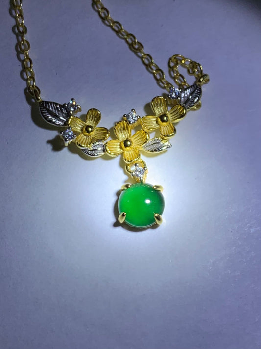 Natural Guatemalan Icy Translucent Vibrant Green Jadeite Spring Flower Pendant Necklace Sterling Silver Adjustable 16”-18.5” 天然高冰危绿翡翠银镶锁骨链