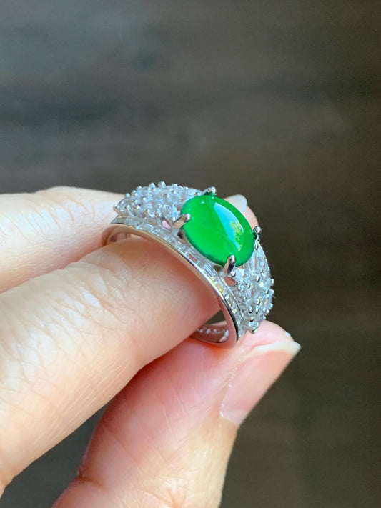 Natural Grade A Guatemalan Icy Translucent Vibrant Green Cabochon Jade Jadeite Ring Sterling Silver Size Adjustable 3g 天然冰危绿翡翠银镶戒指 WLO128