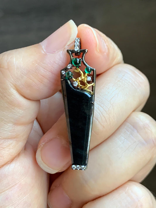 Natural Grade A Guatemalan Icy Highly Translucent Wuji Jadeite Wu Shi Pai Vase Pendant Sterling Silver 3g 天然冰胶危乌鸡翡翠无事牌镶嵌花瓶吊坠 WJP180