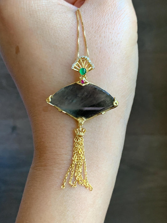 Natural Grade A Guatemalan Icy Highly Translucent Wuji Jadeite Wu Shi Pai Fan Pendant Sterling Silver 4g 天然冰胶危乌鸡翡翠无事牌镶嵌扇子吊坠 WJS150