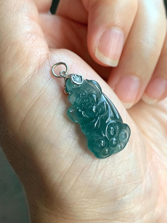 Natural Grade A Guatemalan Icy Translucent Dark Teal Blue Jade Jadeite Lotus Flower Lotus Pod Pendant Sterling Silver 天然冰危深蓝翡翠莲花莲蓬吊坠 WHP280A