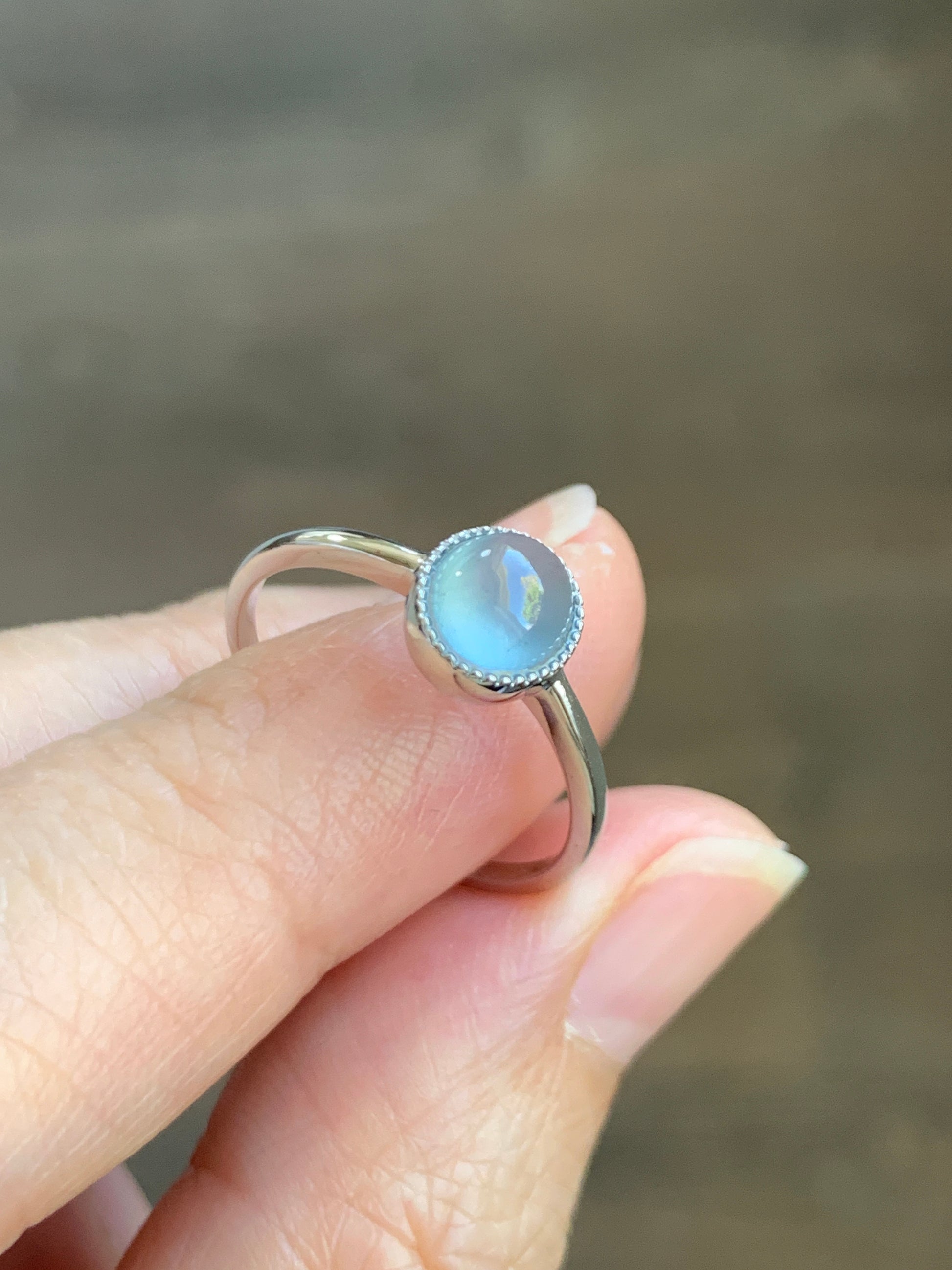 Certified grade A natural Guatemalan Icy highly translucent Jadeite ring set in solid 18K white gold. The ring features an aged icy blue Guatemalan Jadeite oval cabochon. The material have highly translucent clarity, beautiful blue color, super fine and smooth texture and incredible luster. The material is so clear and pure that it appears to glow. The ring setting is a milgraining bezel setting in a solitaire design. It has a sturdy setting and solid band all the way around. It is a simple and elegant style that is versatile to dress with. The jadeite is 100% natural with ZERO treatment. The ring is a size 7. The ring weighs about 1.92 grams. It comes with a certificate of authenticity. Please make sure to review all pictures for details and measurements.