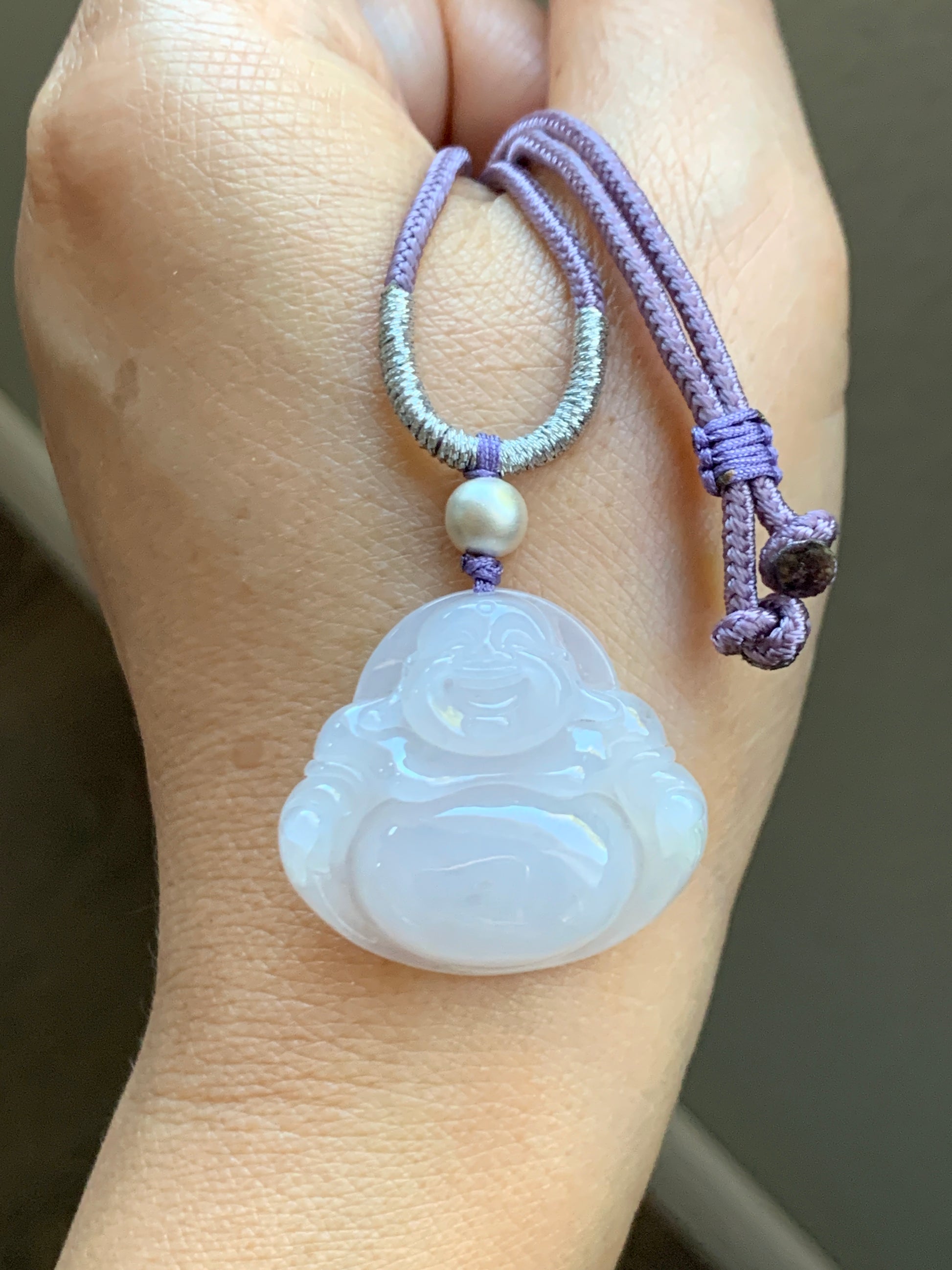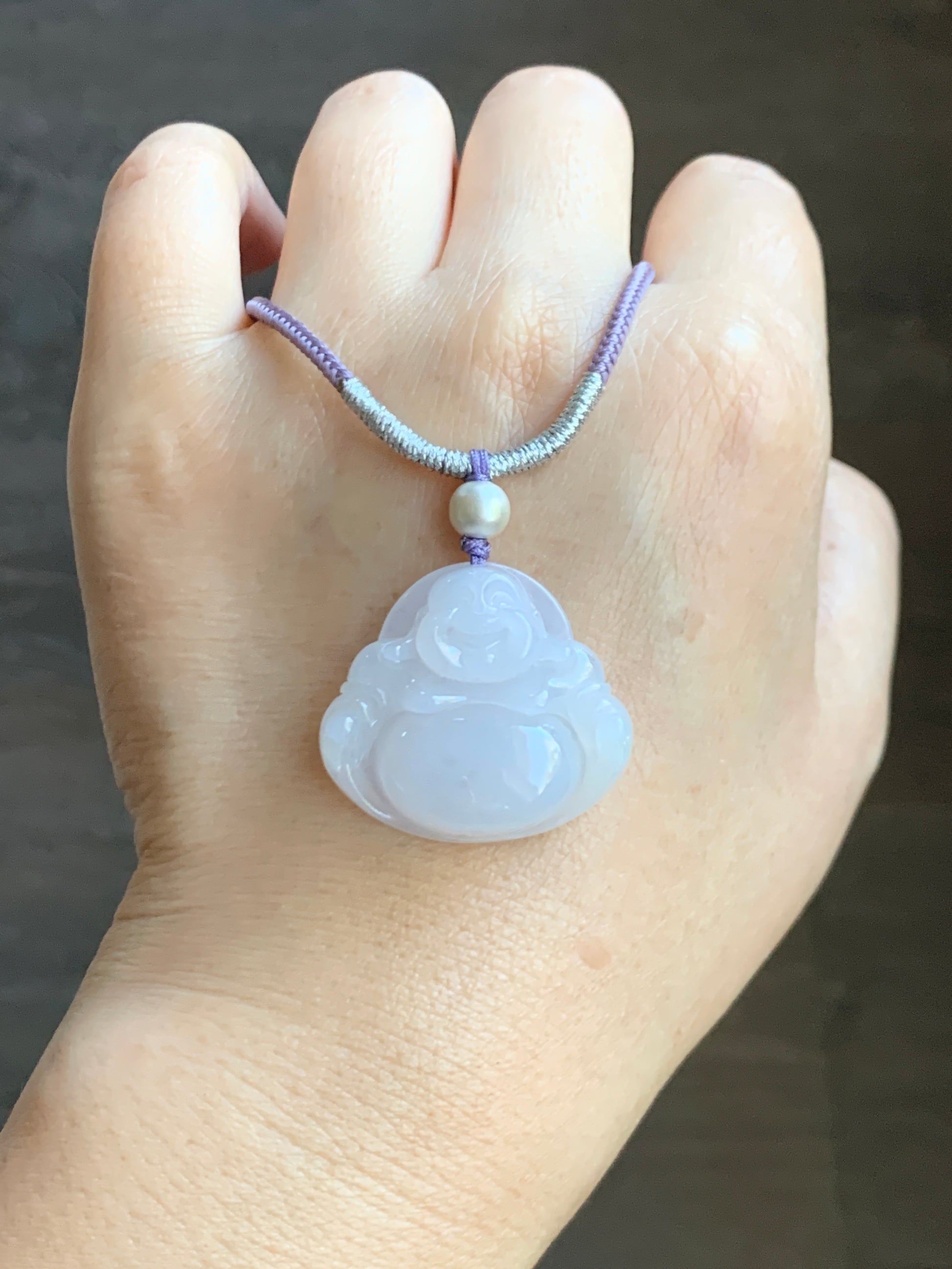 Certified grade A natural light purple jadeite pendant. This material has beautiful icy translucent clarity, exceptionally fine, pure and smooth texture and outstanding luster! The material is so clean and pure that it looks like jelly. This material has soft icy light purple color. The color looks subtle under natural indoor lighting and more saturated under candlelight. This is 100% natural and untreated. The jadeite material is cut into a sitting Buddha. The carving is done completely by hand with beautiful designs and intricate details. This is a relatively large sized buddha pendant with excellent thickness. The buddha weighs 9.05 grams and comes with a certificate of authenticity. There is also a 6mm sterling silver bead above the buddha as accent. It is on a purple and silver colored rope necklace that is adjustable in length up to about 23". Please check out the photos for details and measurements.