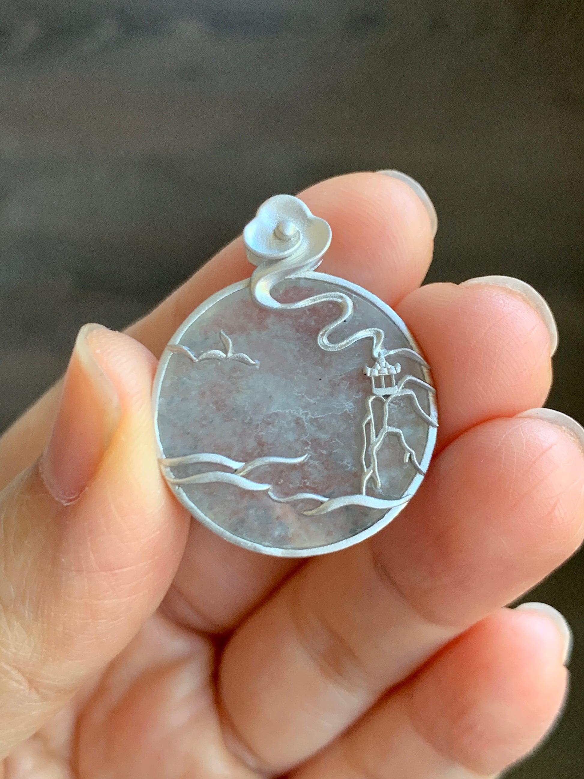 Please Note: there are some stone lines and marbling lines on the surface of the jadeite. They are shown in photos and videos. Please only buy if the imperfection is acceptable to you. The setting is handcrafted with generous amount of sterling silver with satin finish. It has a beautiful landscape design. The entire pendant weighs 5.20 grams and comes with a certificate of authenticity. Please make sure to check out all the photos and video for details and measurements. Chain NOT included.
