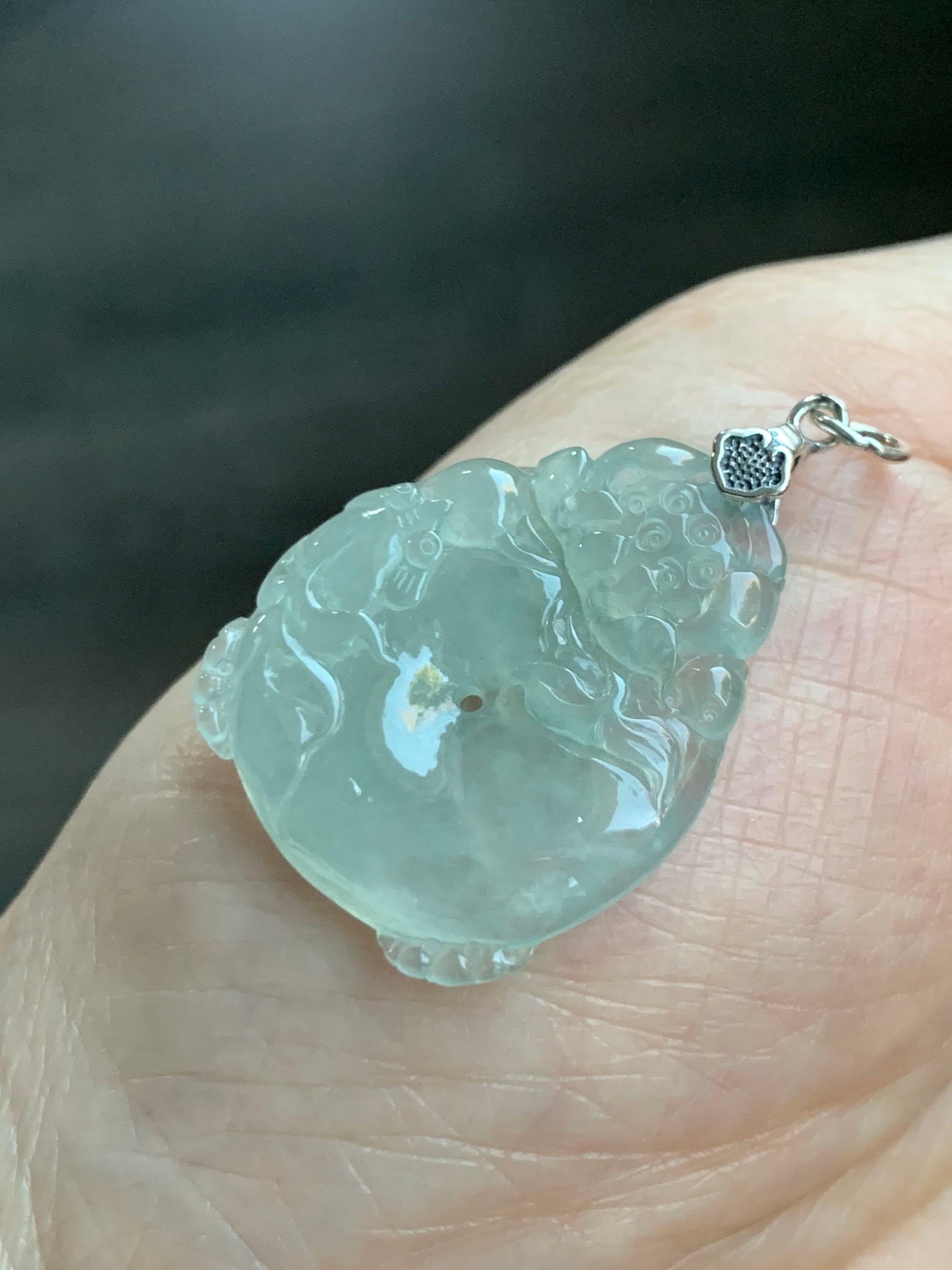 Certified Natural grade A premium Icy Jadeite Carved Ping An Kou Pendant with a sterling silver bail. The pendant features one amazing old mine jadeite that is light green in color, and has very nice icy highly translucent to transparent clarity, incredibly fine, pure and smooth texture that looks like jelly, and exceptional luster. The material is so pure and clear that it shows no crystal structure and appears to glow, and so lustrous that it looks as if it has been dipped in oil.