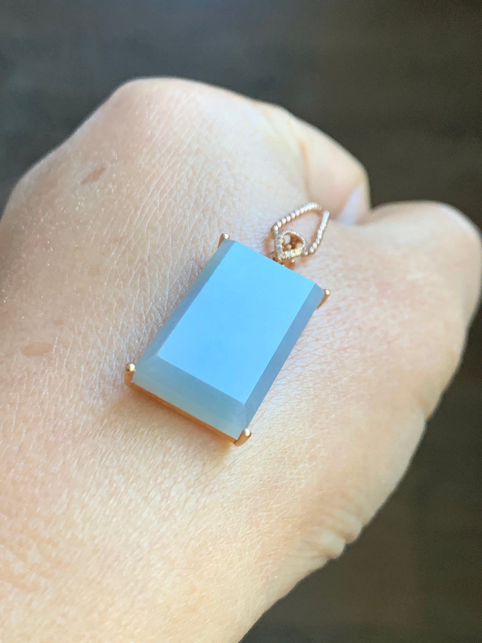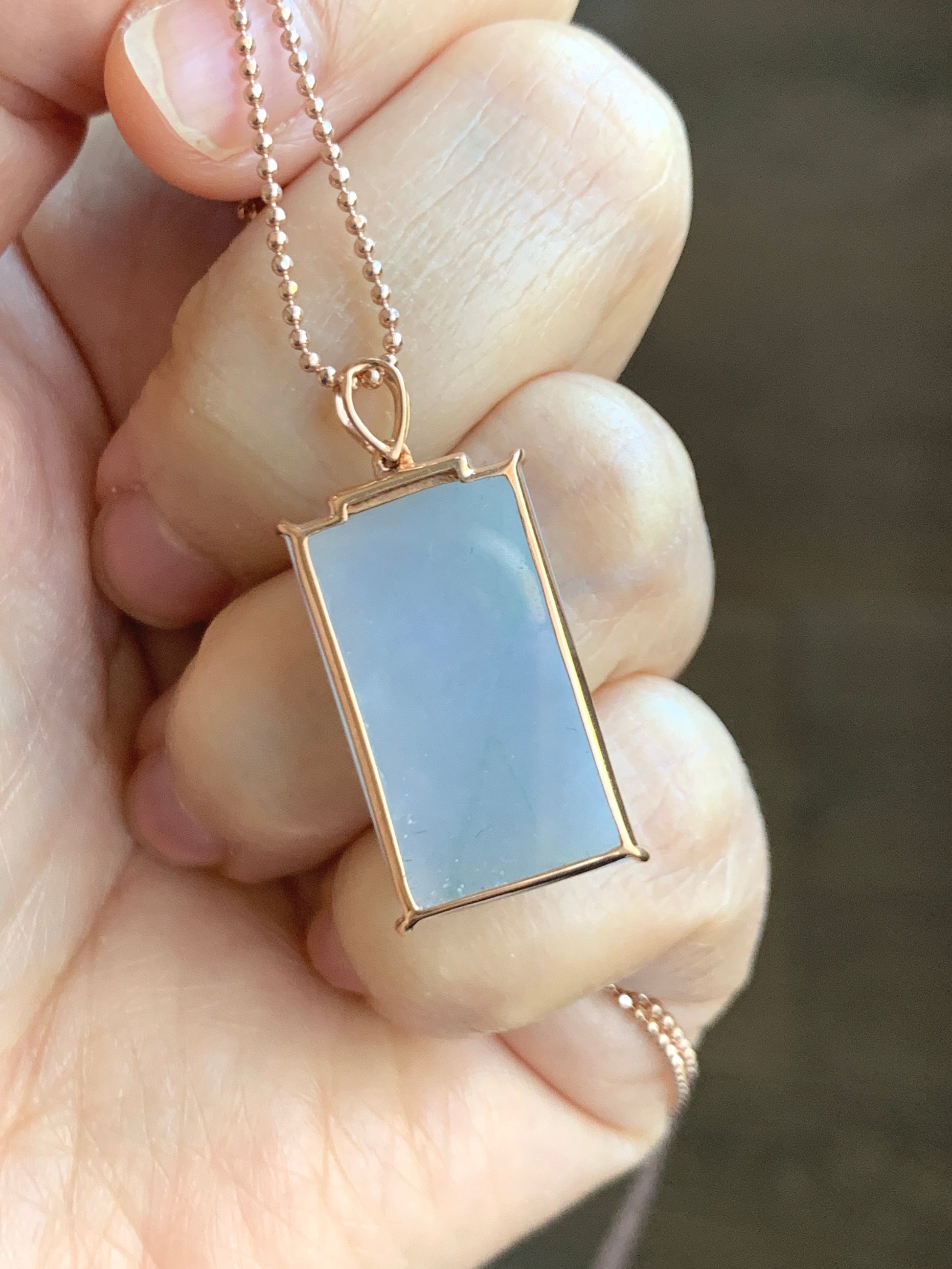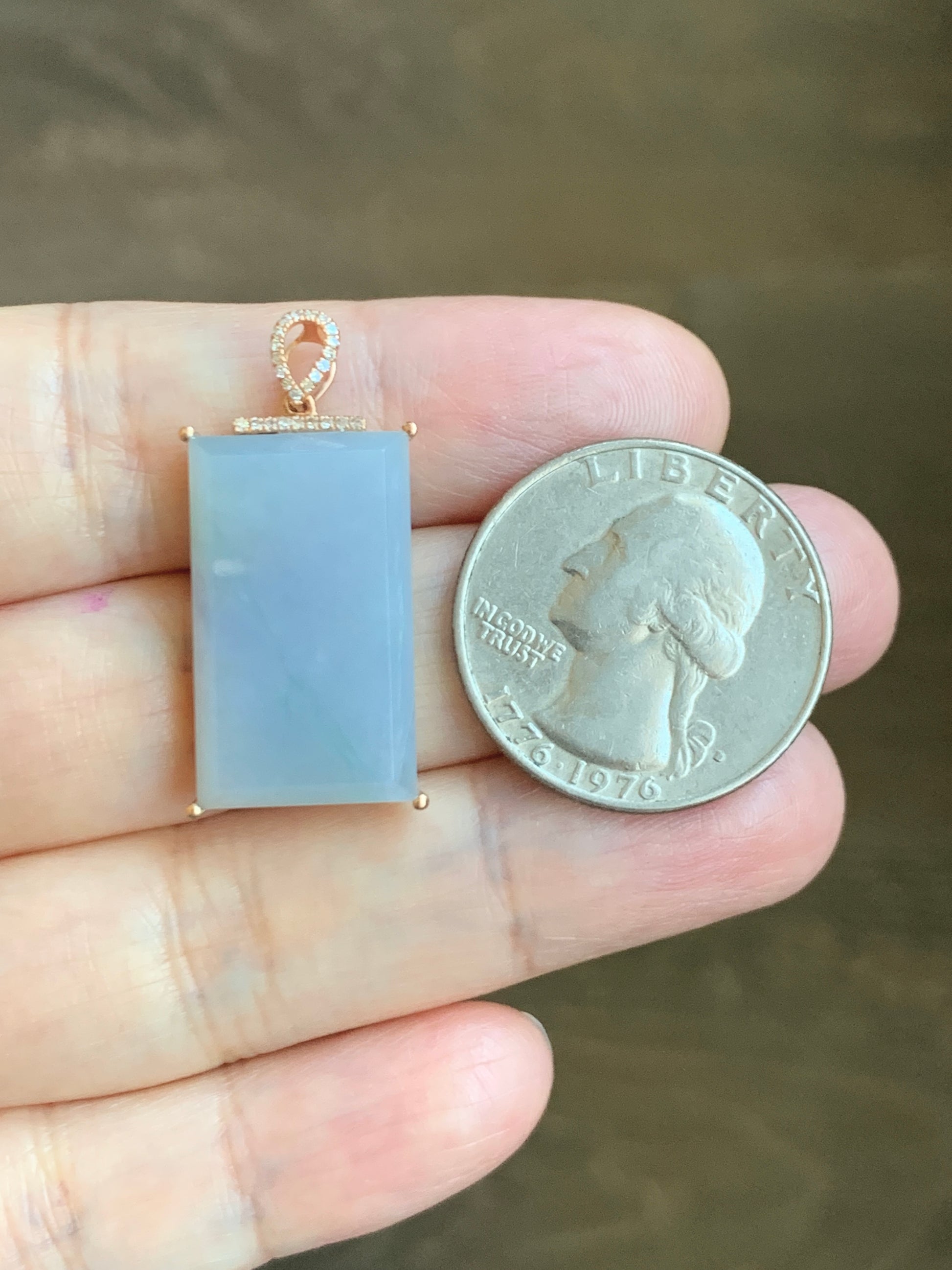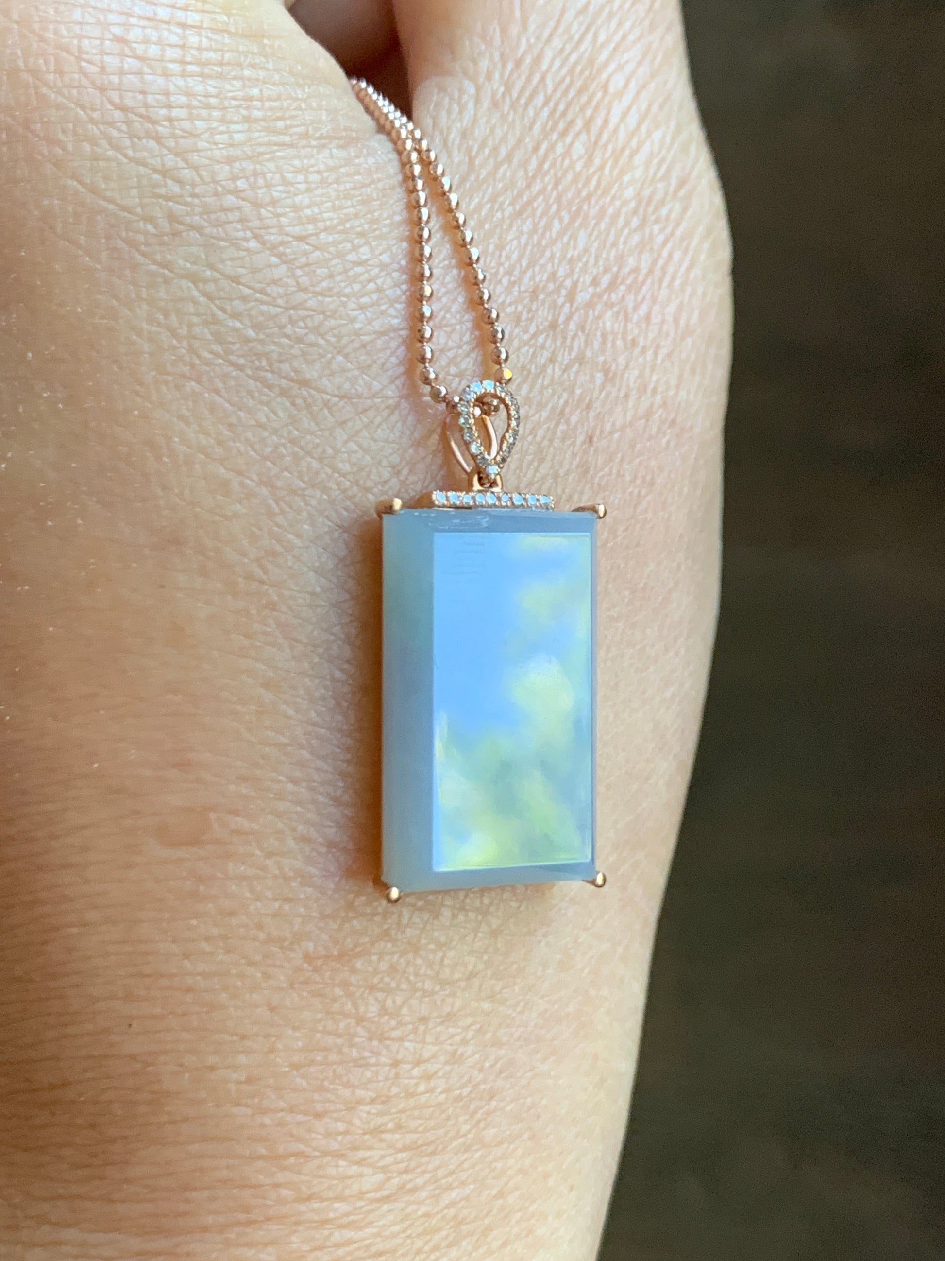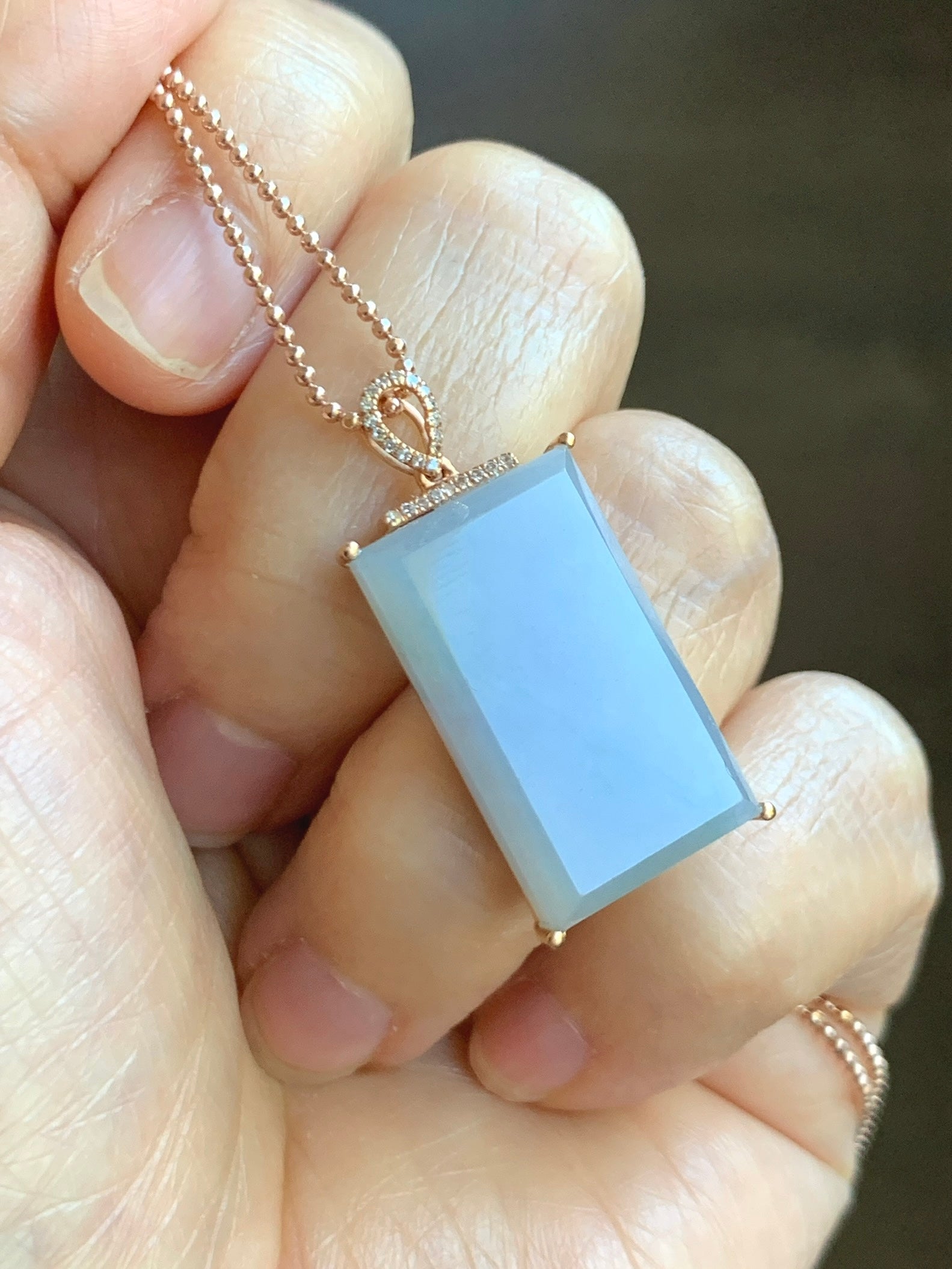 Certified Grade A natural icy Translucent Pastel Purple Jadeite Wu Shi Pai Pendant in 18K Solid Rose Gold and genuine diamonds. The pendant features one nice sized natural icy jadeite that has pastel purple color with subtle green marbling. Please refer to photos for actual measurements. In addition to the beautiful colors, it has icy translucent clarity, super fine, pure and smooth texture that looks like jelly and outstanding luster. Despite thickness, light can travel through the material completely and easily. There is no crystal structure visible. It is exciting to see natural purple jadeite with this kind of color saturation, fine texture at the same time and in this size and thickness! Just a very unique and beautiful material! It is cut into a highly polished rectangle shape with facets on the 4 edges. It is almost like a huge emerald cut. Wu Shi Pai is a type of blessing amulet that usually is made of flawless jadeite pieces. They are simply cut into a certain shape and then highly polished. It bears well wishes for one’s safety. Wu Shi Pai is a classy and simple way to wear amazing quality jadeite.