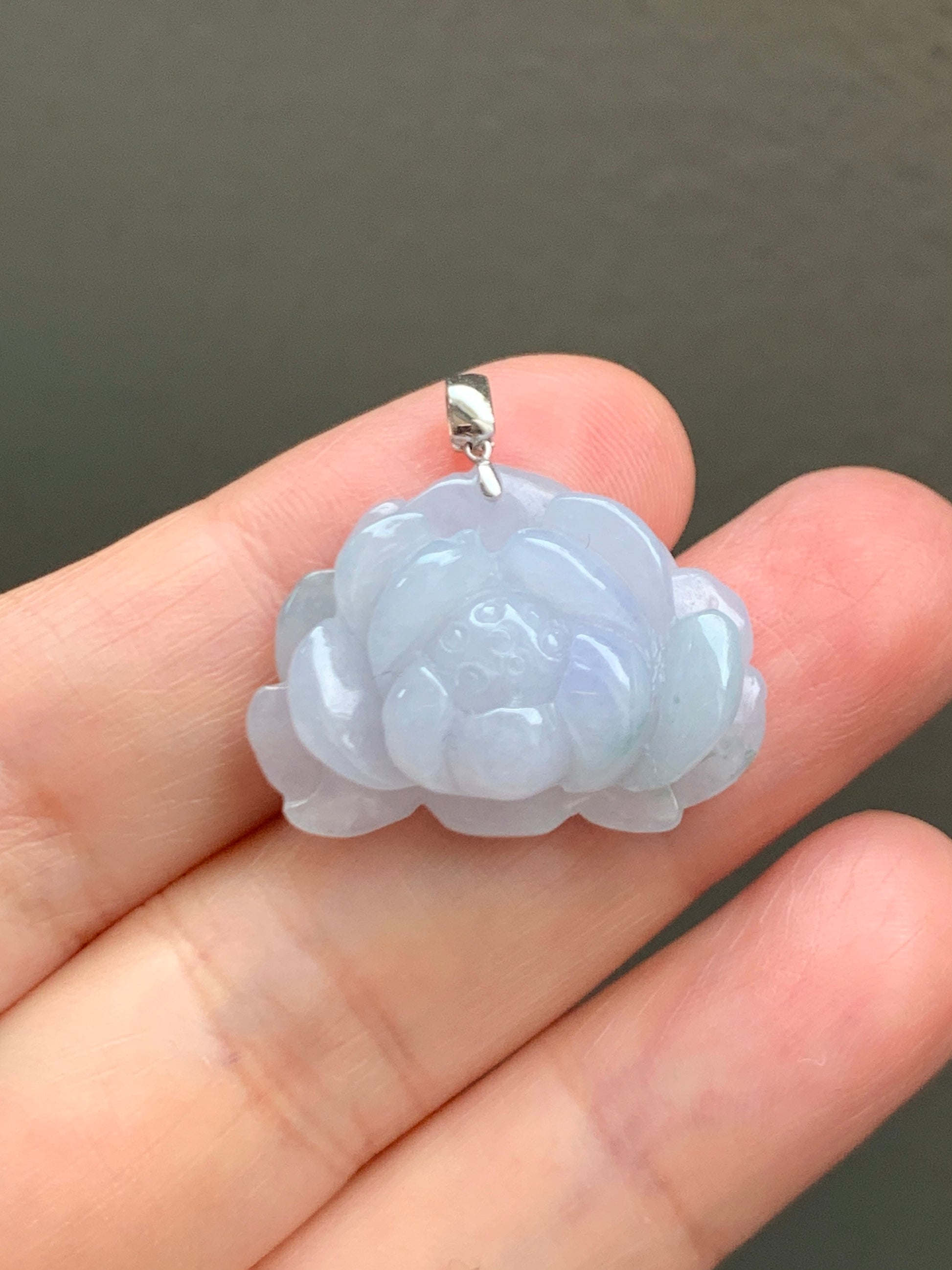 Natural grade A jadeite pendant with a solid 18K White Gold bail. The jadeite is carved into a lotus flower. The carving is done by hand with beautiful designs and intricate details. This is not a petite pendant and with nice thickness. Please refer to the photos for actual measurements. The material has icy translucent clarity, super smooth, fine and pure texture, and outstanding luster. It has pastel purple undertone with a couple small patches of green marbling. This is 100% natural material with zero enhancement. It comes with a solid 18K white gold bail. The opening of the bail is on the small side and is about 3.5mm in height. The pendant weighs about 7 grams. Please check out all pictures for details and measurements. Chain NOT included.